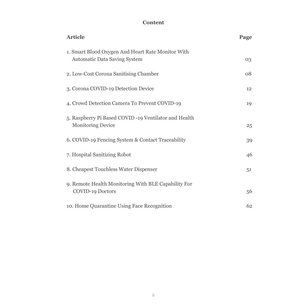 This eBook focuses on DIY electronics projects and technologies developed to combat the COVID-19 pandemic. It includes projects for building a smart blood oxygen and heart rate monitor, a low-cost sanitising chamber, and a corona detection device. The eBook also delves into more advanced creations like a Raspberry Pi-based ventilator and a hospital sanitising robot. Beyond physical devices, it explores solutions for public spaces and personal safety, such as a crowd detection camera to prevent COVID-19, a fencing system for contact traceability, and a touchless water dispenser.