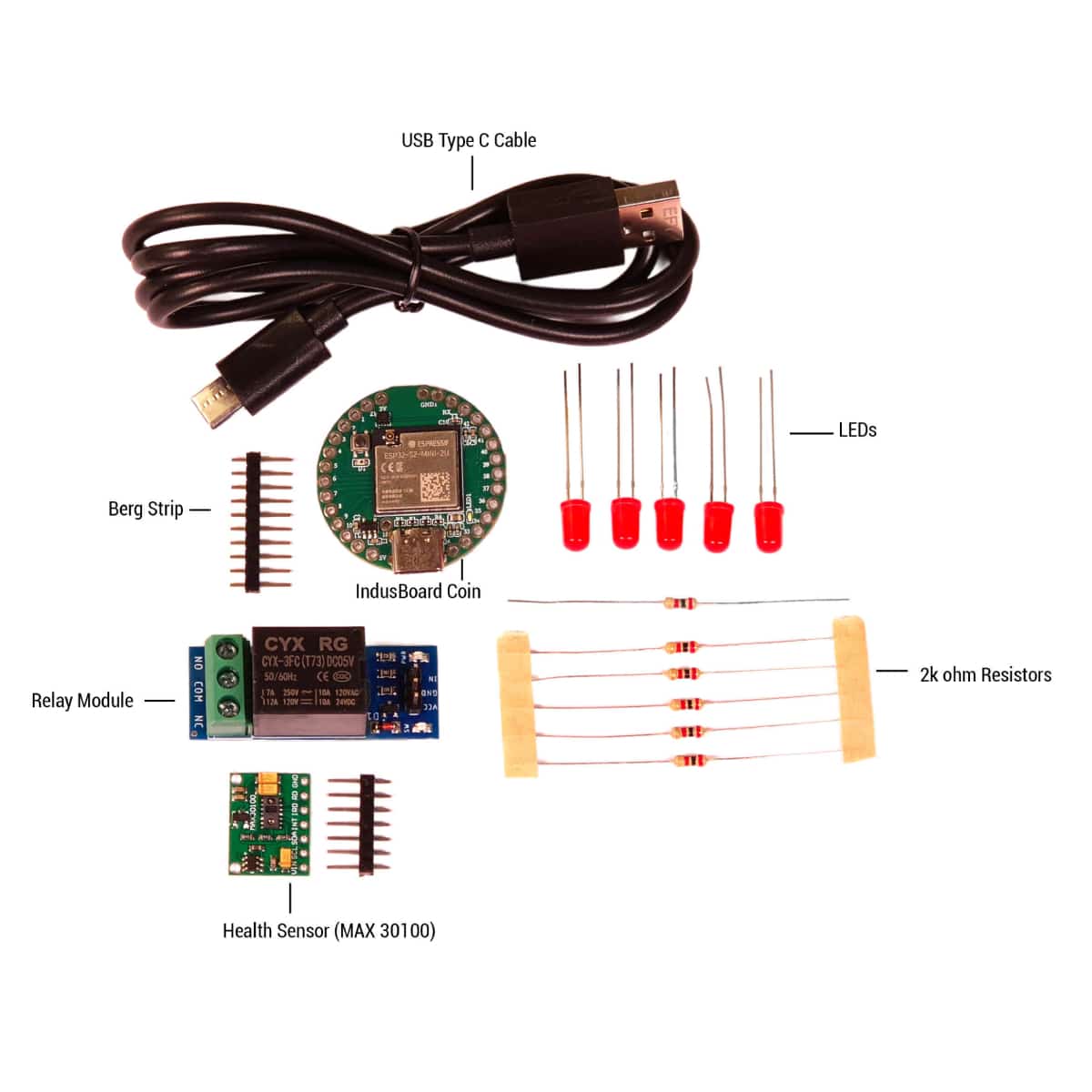 First, this kit is based on the super-small sized and super-light development board: the IndusBoard COIN, which is counted amongst the world’s smallest development boards for advanced IoT and electronics projects. This board also provides WiFi capability enabling you to develop projects which include features such as: remote patient monitoring, sending alerts, movement tracking. And, then you also have on-board built-in sensors like the accelerometer and magnetometer to track the patient or the device itself! So you don’t need to add external sensors.