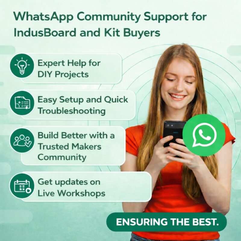 Once you buy the kit, you will get invited to our WhatsApp community, where you can seek help or guidance from our Tech Team, including the inventor of IndusBoard Coin. Plus, 100s of community members are there to offer help and share new exciting ideas.
