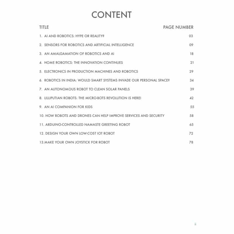 The eBook provide a comprehensive view, starting with whether AI and Robotics is “hype or reality” and then delving into the core components, such as sensors for robotics and AI. It covers a wide range of applications, from home robotics and electronics in production machines to their role in improving services and security alongside drones. The book also addresses social and ethical questions, such as whether smart systems will invade our personal space in India. For enthusiasts and hobbyists, the eBook includes practical, do-it-yourself (DIY) projects, offering instructions on how to build an Arduino-controlled Namaste greeting robot, design a low-cost IoT robot, and even make a joystick for robot control. It also explores cutting-edge topics like Lilliputian robots and the creation of AI companions for kids.