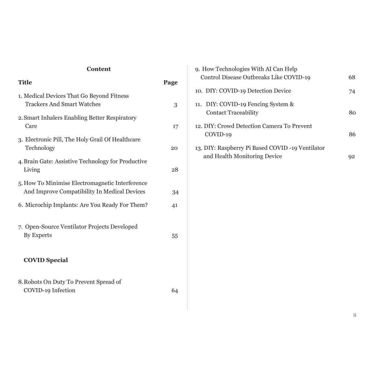 This ebook explores the intersection of technology and healthcare. It covers a range of topics, including wearable medical devices that go beyond traditional fitness trackers to monitor vital signs and assist with rehabilitation. It also discusses the role of smart inhalers in managing respiratory diseases like asthma , the potential and challenges of brain-computer interfaces like Brain Gate for assistive technology , and the use of microchip implants for medical history access and identification. Additionally, it also includes articles on minimising electromagnetic interference in medical devices, using AI and robots to control disease outbreaks, and DIY projects for building devices to detect COVID-19 symptoms and aid in ventilation. It highlights how these technologies are making healthcare more accessible and personalised, while also addressing the design challenges related to comfort, power consumption, data security, and regulatory compliance.